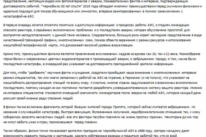 В отзыве 2017 года с разных аспектов рассматривается информативный и интересный документальный фильм о катастрофе на АЭС в Чернобыле.