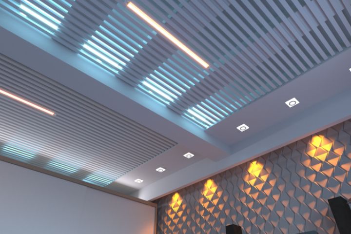 Несущие деревянные балки в 100 летнем доме обыграны нестандартным способом, я применил деревянные рейки и гипсокартон с краю у стены для скрытой подсветки стеновых панелей.