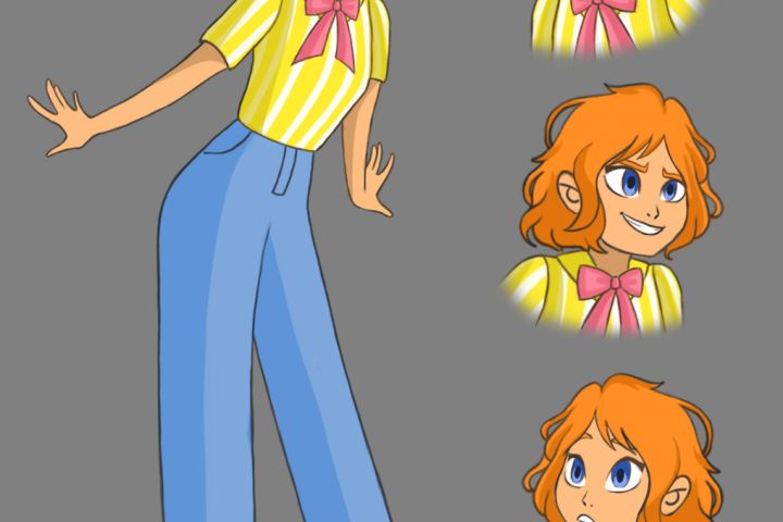 Концепт арт девушки. Согласно ТЗ она должна быть веселой, рыжей и жизнерадостной, с "искрой в глазах". По характеру - озорная непоседа. Одета в простые классические синие джинсы, белые носочки, полосатую футболку и с розовым бантом на шее. Волосы до шеи, вьющиеся и непослушные.