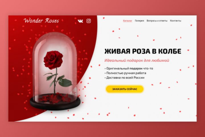 Лендинг по продаже роз в колбе. Приятные розовые тона, летающие лепестки роз и легкий воздушный дизайн.