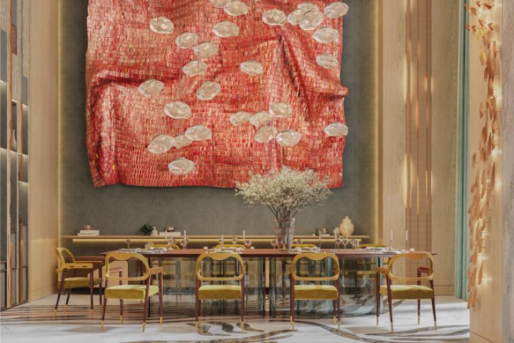 Единое пространство гостиной и столовой на вилле представляет собой сложное стилически-дизайнерское и техническое проектное решение. Клиентом был заказан абсолютно современных в техническом отношении проект 9-этажной виллы. Стилистика представляет собой абсолютную эклектику с акцентом на ардеко и бионику