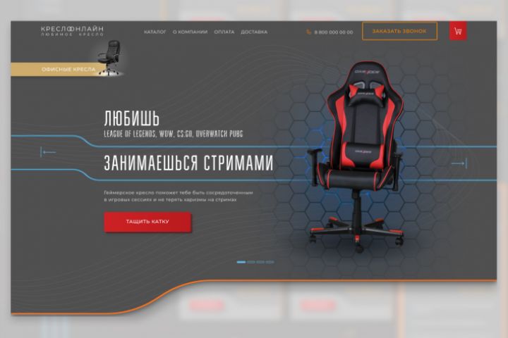 Атмосферный дизайн сайта по продаже геймерских кресел. Цветовая гамма, графические образы подчеркивают принадлежность к игровой среде и настраивают посетителей на покупку.