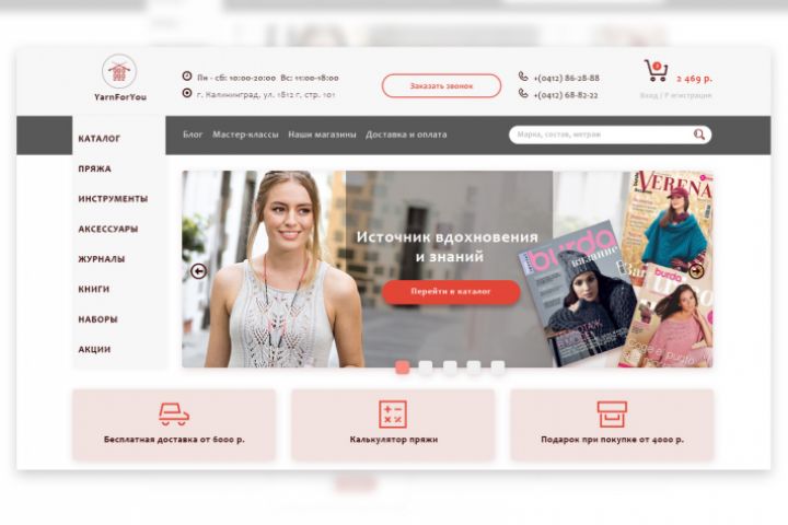 Теплые цвета создают атмосферу домашнего тепла и уюта, которая свойственна вязанным вещам ручной работы. Идея нашла отражение в круглых формах графических элементов и мягких тенях.