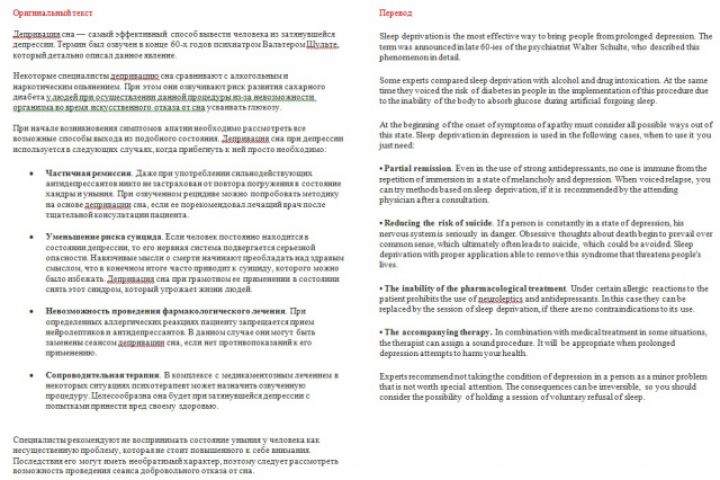 Перевод меню статьи о депривации сна (психиатрия) с русского на английский
