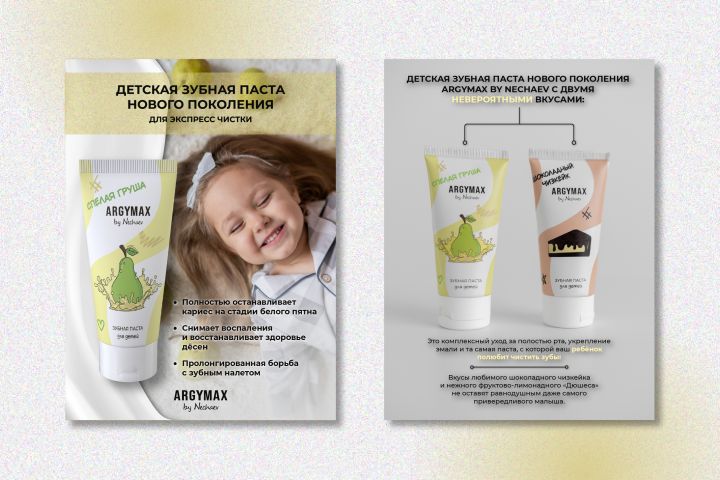 Задача: разработать дизайн карточки товара на маркетплейс. Продукт - детская зубная паста "Argymax by Nechaev".