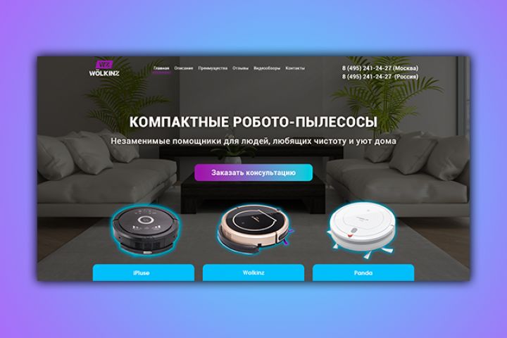 Главная страница рекламного сайта для роботов-пылесосов. На сайте продаются три модели робото-пылесосов. Под каждую из моделей есть еще внутренняя страница сайта с одинаковой главной страницей, но разным внутренним наполнением.