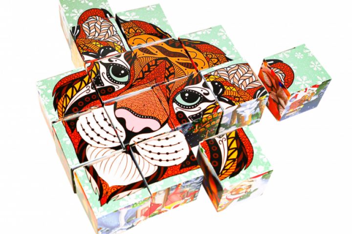Задачей было создать две иллюстрации для новогоднего набора с пазлами из кубиков: 1 - Иллюстрация в стиле дудл в форме головы тигра 2 - Иллюстрация прямоугольного формата с двумя влюбленными тиграми с новогодней атрибутикой