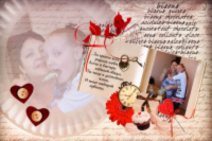 Коллаж состоящий из фотографий, текста поздравления, а также объектов из скрап-наборов.