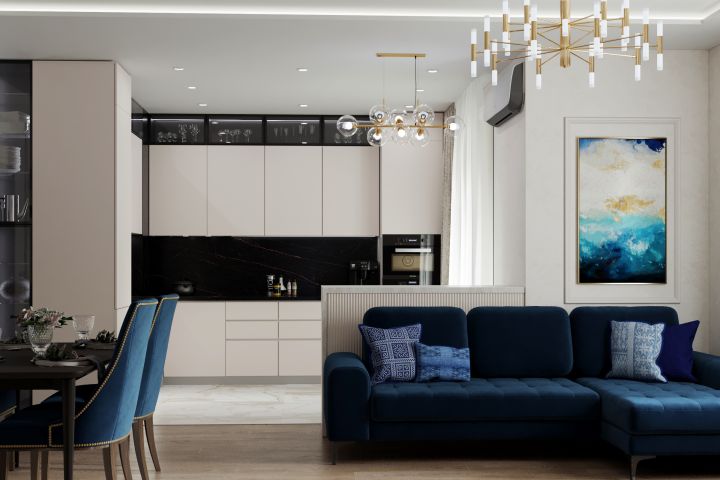 Кухня-гостиная в сочетание стилей минимализм и неоклассика