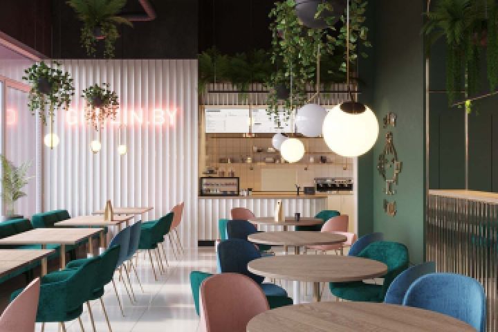 Перед архитекторами поставили задачу создать запоминающееся и необычное место. Ставку решили сделать на яркие и контрастные цвета и текстуры. Мы использовали в интерьере лаконичные поверхности. Основа колористической палитры — изящный изумрудный цвет. Выбором для сопутствующих оттенков стали пурпуровый розовый и бирюзовые оттенки.