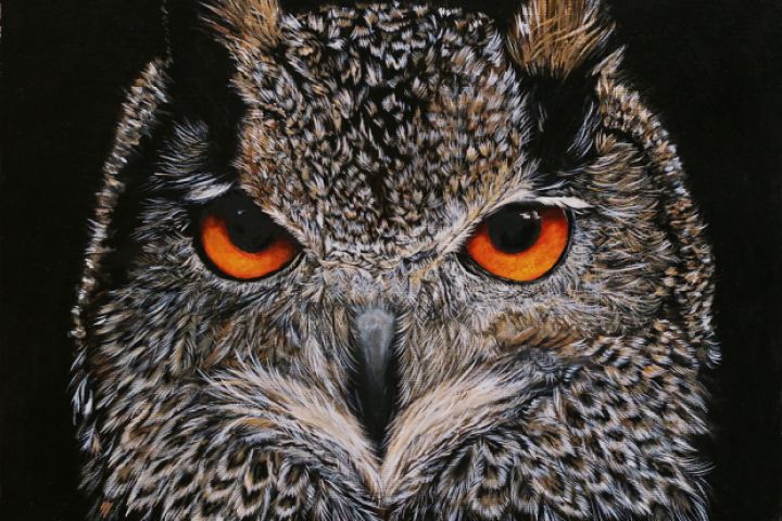 Черная сова, black horned owl staring, vibrant eyes against black background. SOLD! Картина продана