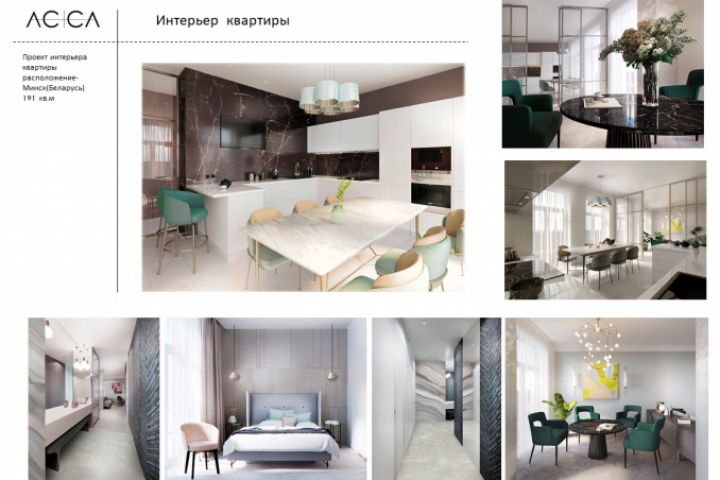 Гостиная, столовая кухня и гостевой сан. узел разместились в одной квартире, а спальня кабинет ,две детские, гардеробные,