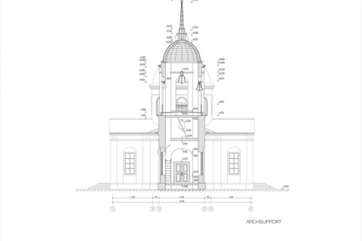 Реконструкция церкви - архитектурный учебный проект. Разрез колокольни. Оформление разреза по ГОСТ. Архитектурная графика.