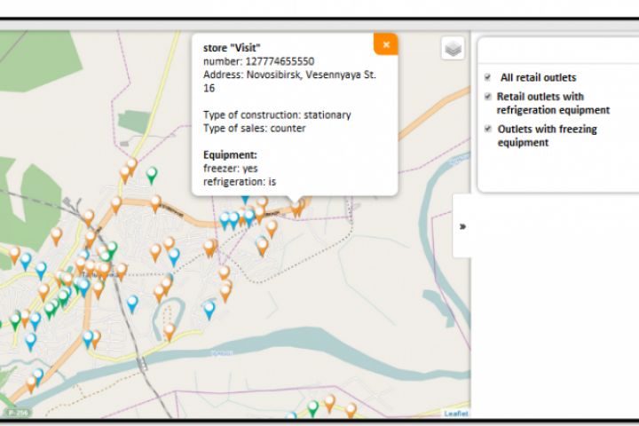 Задача: Вывести на карту розничные торговые точки, собранные с помощью сенсуса, с описанием и фото фасада. Добавить фильтрацию по виду оборудования.