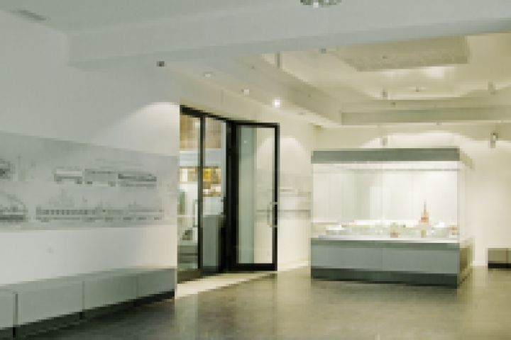 Вход в основной зал музея. На стенах вестибюля росписи с рельсовым транспортом.
