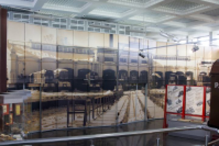 Механизированная стена-ширма с изображением револьверного депо. За ширмой скрывается часть экспозиции музея.
