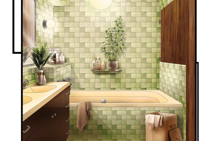 Графически выполненная подача концепции интерьера ванной комнаты. Adobe Illustrator, Adobe Photoshop.