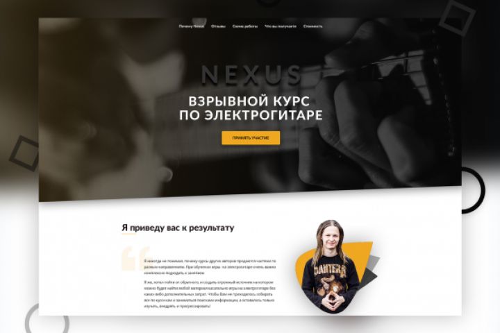 Amazing guitar - сайт по обучению игре на электрогитаре. Необходимо было разработать дизайн для одного из эффективных курсов по обучению "Nexus". Задача сделать продающий LP, который показывает преимущества покупки именного этого курса.