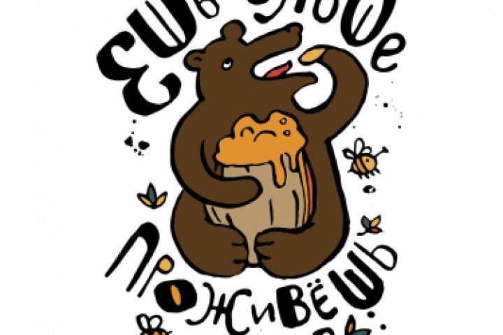 Ешь больше, проживешь дольше -персонаж и леттеринг для принта магазина фермерских продуктов. Тушь перо, векторная графика.