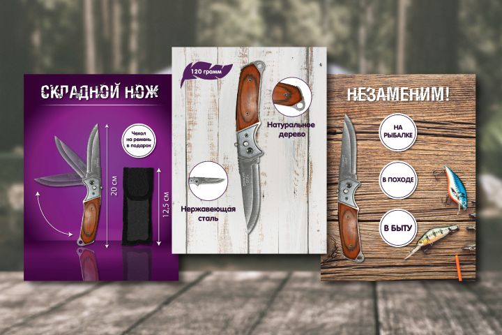 Заказчиком было дано задание: разработать инфографики для складного походного ножа, показать размеры и примеры использования