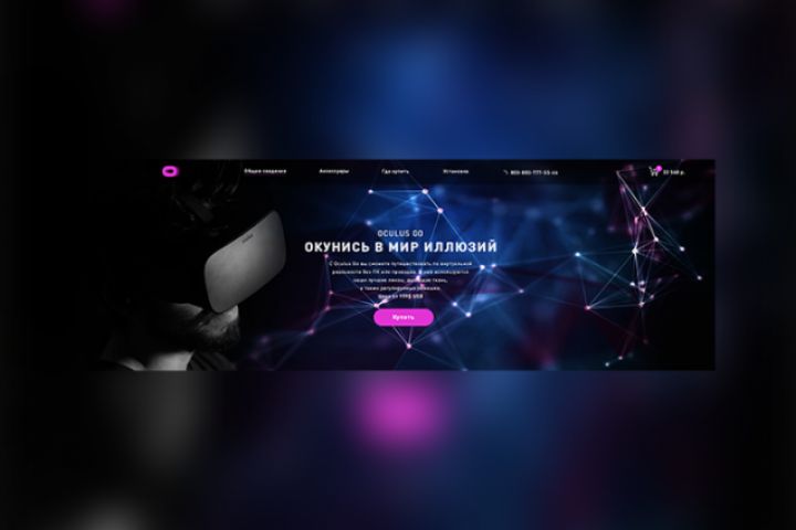 Дизайн LP для компании, занимающейся продажей очков виртуальной реальности. Основная идея - уже с первого экрана погрузить посетителя сайта в футуристичный мир виртуальной реальности.