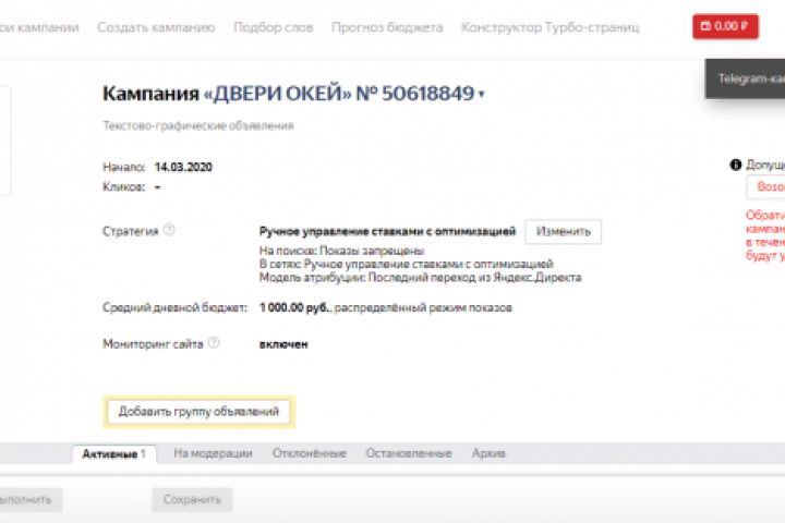 Создание и настройка "под ключ" рекламной кампании для продвижения сайта "Двери Окей".