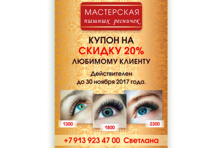 Купон на скидку "Мастерская пышных ресничек", размер А6