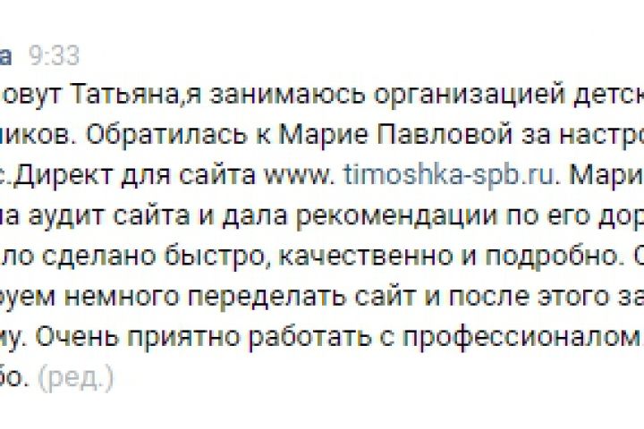 Провела аудит сайта и анализ конкурентов, ниша -организация детских праздников. Заказчик будет дорабатывать сайт и потом планируем запускать рекламную кампанию.