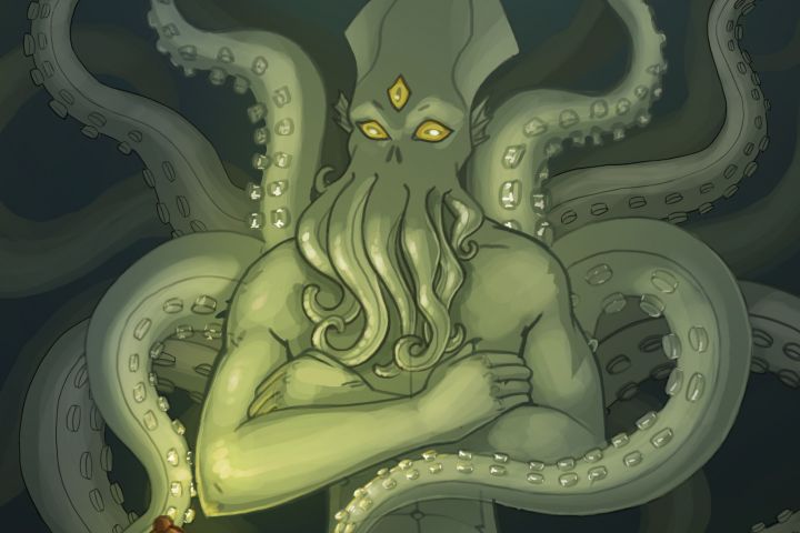 Иллюстрация по мотивам рассказов Говарда Лавкрафта "Ужас глубин", огромный мистер кальмар в мрачных раздумьях даже не обращает внимания на пришедшего к нему гостя.