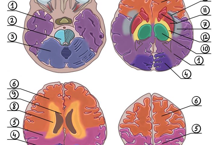 Анатомический рисунок срезов мозга на разных уровнях для медицинского кардиологического журнала.