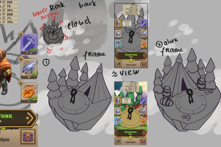 Разработка сцены при выборе героя, концепт для 3д художников, набросок сцены как она собирается в юнити.
