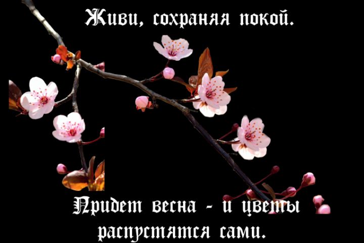 Может показаться, что ветка некорректно обрезана, но это не так. Макет создавался в фоторедакторе Photoshop, были использованы инструменты "Кадр", "Лассо", "Штамп", "Размытие". Шрифт - "CylliricGoth". Обратная сторона открытки выполнена в виде почтовой карточки в минималистичном дизайне. Здесь размещена надпись «POSTCARD», что в переводе с английского значит «Почтовая карточка», надпись выполнена в том же шрифте - "CyrillicGoth", что и фраза на лицевой стороне. Ниже под надписью с правой стороны находится разметка для нанесения информации к отправке и окно, куда клеится почтовая марка, а также форма для заполнения индекса. Левая сторона будет содержать изображение цветов в стиле «графика» для поддержания общей композиции и тематики.