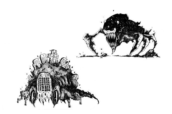 Подборка персонажей - монстры в стиле Dark Fantasy. Традиционная графика (чёрная гелевая ручка)