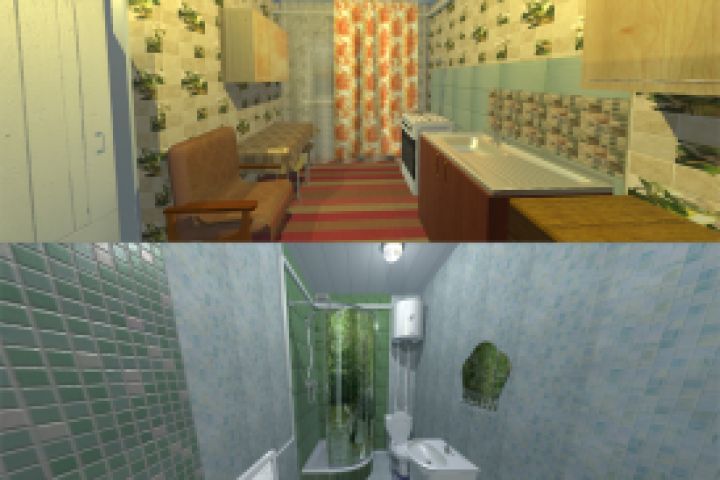 На сцене реализовано: отражения в реальном времени, имитация затухания звука, физика взаимодействия ткани и игрока (занавески), включение/выключение освещения с анимацией, включение/выключение водных кранов (частицы и анимация) и др.