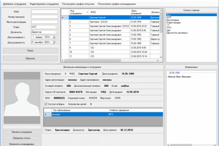 - др. функции, такие как: вывод именинников, загрузка фотографии и тп.