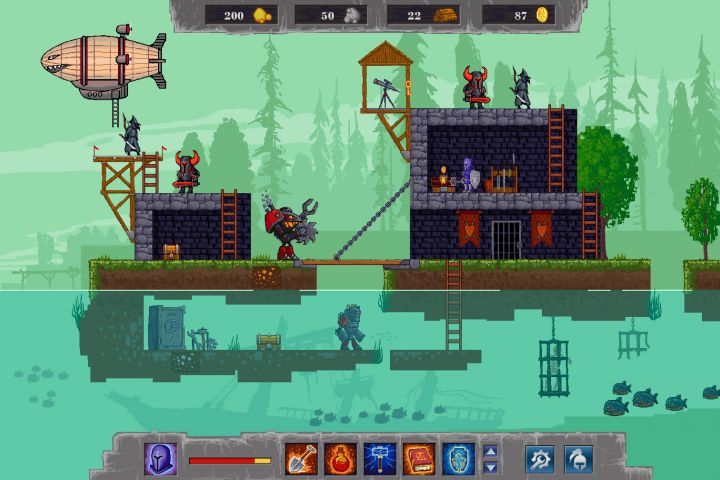 Концепт визуала для пиксель игры включая персонажи и интерфейс.