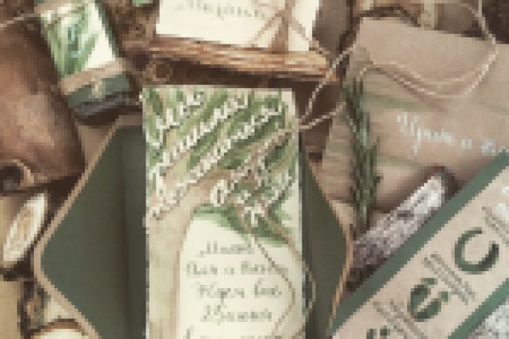 Разработка концепта, дизайн, каллиграфия пером и кистью, оцифровка свадебного сета для церемонии на ферме. Состав сета: приглашение, конверт, карточка дресс-кода, схема проезда, карточки рассадки, меню, номера столов.