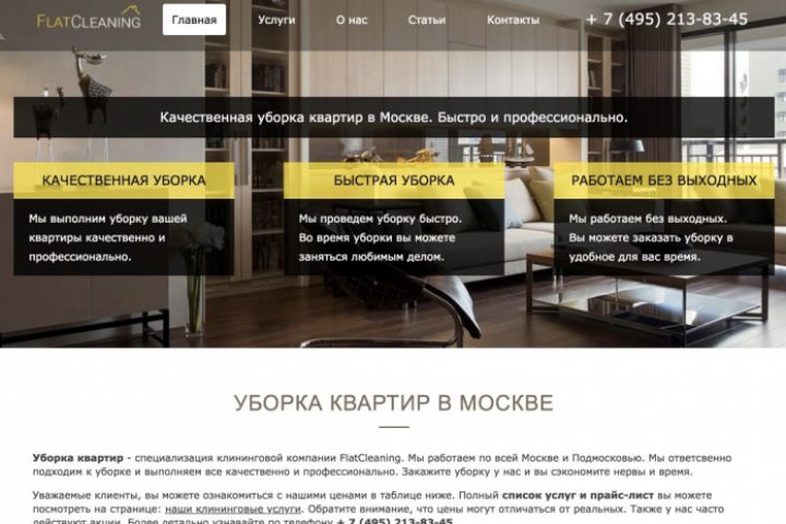 Создание сайта клининговой компании по региону Москва и Московская область, отрисовка дизайна, вёрстка, подключение CMS.