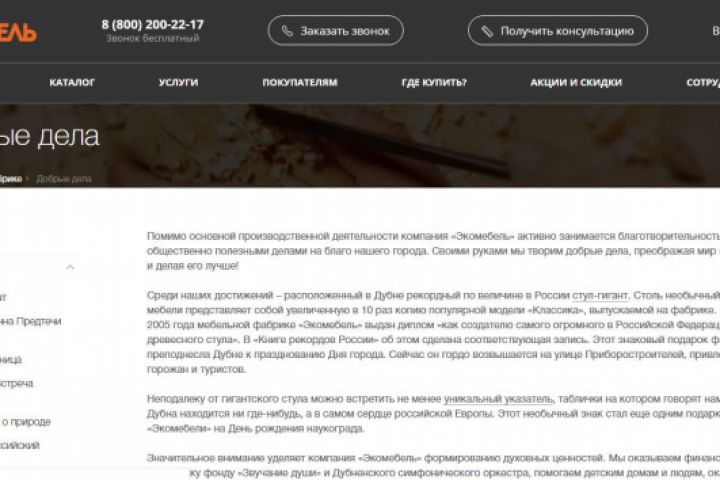 Статья о благотворительной деятельности в раздел "О компании" для сайта мебельной компании "Экомебель"