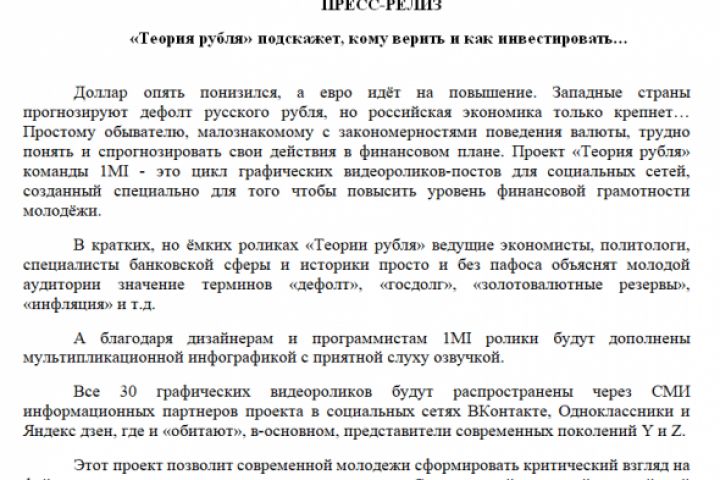 Пресс-релиз для проекта "Теория рубля", главной задачей которого является ликвидация экономической неграмотности современной молодёжи. Работа написана за 1 день грамотным и красивым языком.