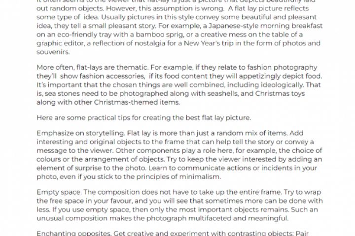 Статья на английском языке для блога канадской фотостудии про фотографию в стиле флэт-лэй.. Объём: 7500 знаков. Уникальность: 100%. Выполнена за 3 дня.