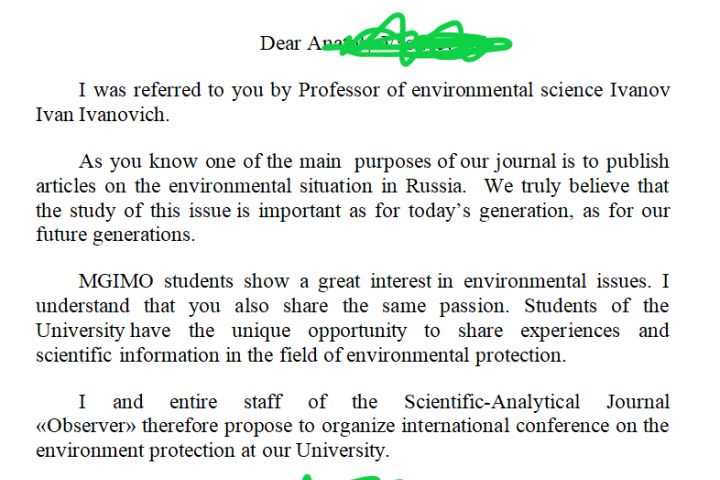 Письмо на английском языке с предложением организовать конференции по охране окружающей среды на международном уровне.