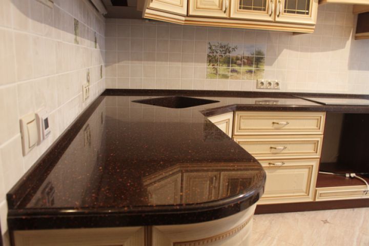 Столешницы могут быть изготовлены из листового или жидкого камня. Последний покрывают особым грунтом, который имитирует цвет натурального минерала. При использовании листового камня листы наклеивают на фанерную основу с помощью герметика. В обоих случаях поверхности шлифуются до гладкого состояния.