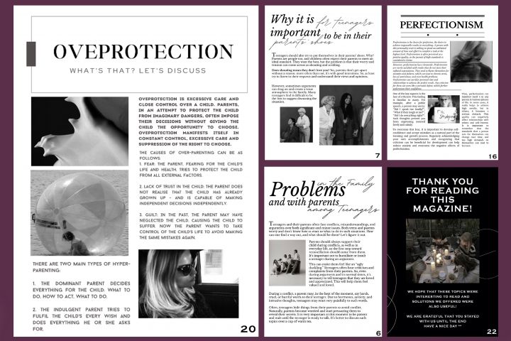 В 2024 году я и команда Y&M создали журнал, посвященный проблемам современных подростков. Если у вас уровень английского B1+ и вам интересны темы, поднимаемые в журнале, - это отличная возможность попрактиковать чтение на английском языке и взглянуть на подростковые трудности с разных сторон. В данном проекте я принимала участие как ведущий дизайнер (занималась версткой и дизайном каждой страницы, оформлением оглавления, поиском референсов).