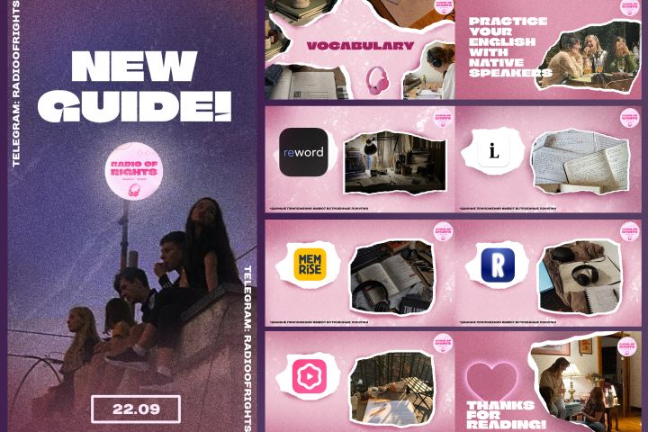 В данном проекте я принимала участие совместно с командой дизайнеров (помогала в создании фирменного стиля, оформлении постов и гайдов, обложек на ютуб канал - https://youtube.com/@radioofrights?si=5Hq1Udo7hJPjR0gG).