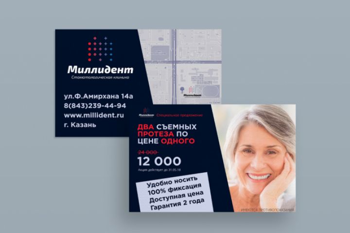Необходимо было сделать двухстороннюю листовку с акцией для стоматологической клиники с текстом заказчика.