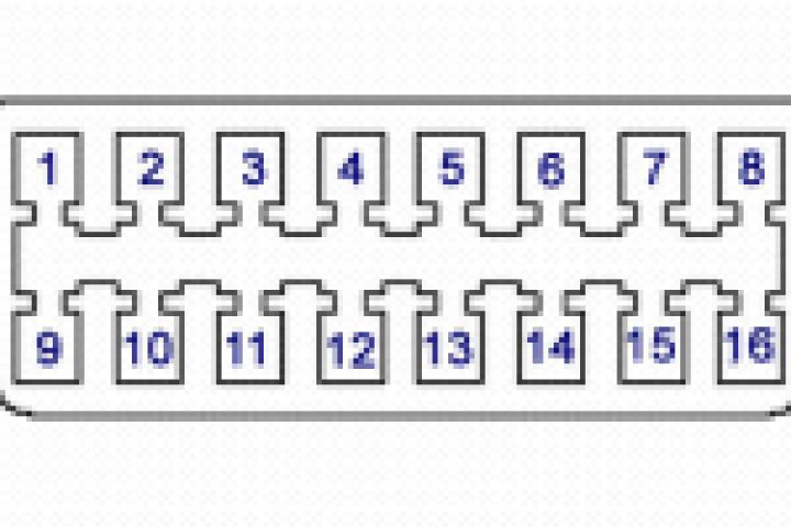 В рамках диагностического стандарта OBDII существует 5 основных протоколов обмена данными между электронным блоком управления (ЭБУ) и диагностическим сканером. Физически подключение автосканера к ЭБУ производится через разъем DLC (Diagnostic Link Connector), который соответствует стандарту SAE J1962 и имеет 16 контактов (2x8). Ниже представлена схема расположения контактов в разъеме DLC (рисунок 1), а также назначение каждого из них.