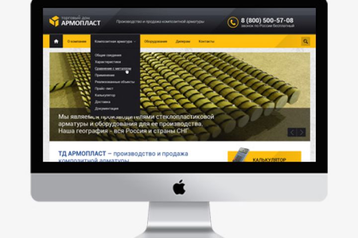 Сайт под ключ для компании, занимающейся производством и продажей композитной арматуры. Сетка - bootstrap, адаптация до планшетов. Дизайн выполнен в строгом, немного индустриальном стиле. Помимо главной также сделано несколько видов страниц для вывода различной информации (текст, фотографии, прайс-листы, документация и т.д.) Также на сайте сделана форма обратной связи и калькулятор для расчета и отправки заказа.