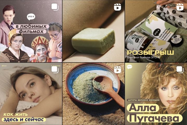 Профиль в Instagram для бренда косметики. Публикации включают фотографии продукции, советы по уходу и рекламные посты.