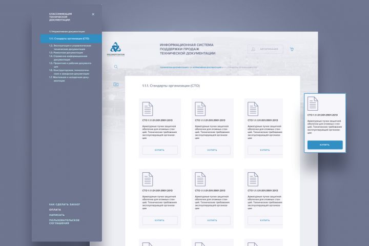 Дизайн интерфейса для системы поддержки продажи технической документации, показывающий стандарты документов и варианты покупки.